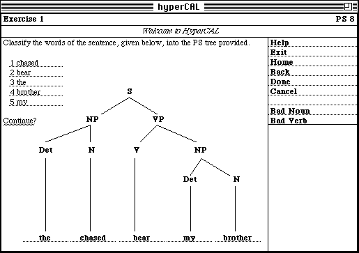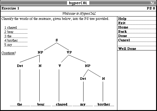 As described in the previous section, all HyperCAL nodes require some degree of processing by the user, e.g. all our exercises prompt the user to fill-in the form of data fields, which represent the elements of a phrase-structure tree (cf. figure 4). Once the user complies with the instructions supplied with the exercise and completes a problem solution (by selecting "Done" from the supplied menu), HyperCAL first stores the solution in the User Model, and then invokes several assessment procedures being part of the HyperCAL Domain Model. HyperCAL feedback on this assessment is passed back to the user in a form of a new menu. The menu will allow the user to navigate to only those destinations which are most relevant to the current state of user knowledge, the problem at hand, the solution provided by the user, and the assessment made by HyperCAL.